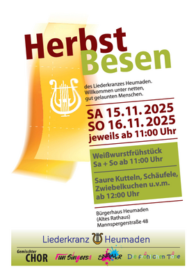 Der Liederkranz Heumaden lädt wieder ganz herzlich zu seinem traditionellen Herbst-Besen ins Alte Rathaus Heumaden, Mannsperger Straße 48. Am Samstag, 15.11. und am Sonntag, 16.11. kann man in den liebevoll renovierten Räumen des Bürgerhauses gemütlich zusammensitzen, ein Schwätzle halten und es sich schmecken lassen. Mittags und abends darf man sich bei einem Viertele Wein auf hausgemachte schwäbische Gerichte wie Schäufele, Sauerkraut, Zwiebelkuchen, Maultaschen, Kartoffelsalat etc. freuen. Ebenso wie letztes Jahr werden für die Liebhaber der schwäbischen Küche auch Saure Kutteln angeboten, da dieses Angebot sehr gut angenommen wurde. Außerdem gibt es an beiden Tagen ab 11:00 Uhr Weißwurstfrühstück. Nachmittags steht eine große Auswahl an selbstgebackenen Kuchen zur Auswahl. In zwangloser Atmosphäre lassen sich ein paar schöne Stunden unter fröhlichen Leuten verbringen. Der Herbst-Besen öffnet sowohl am Samstag wie auch am Sonntag um 11:00 Uhr und kostet keinen Eintritt.