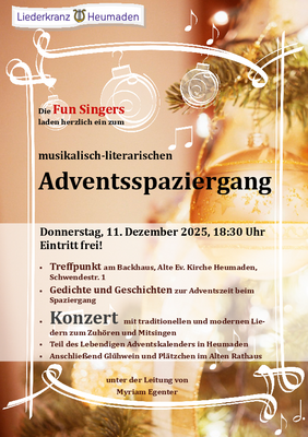 Adventsstimmung mit den Fun Singers! Wir treffen uns um 18:30 Uhr vor der Alten Evangelischen Kirche in Heumaden, Schwendestraße 1, und laufen durch das Gebiet Schwende. Unterbrochen wird der Spaziergang von Lesungen mit Gedichten und Geschichten zur Adventszeit an 3 - 4 Stationen.